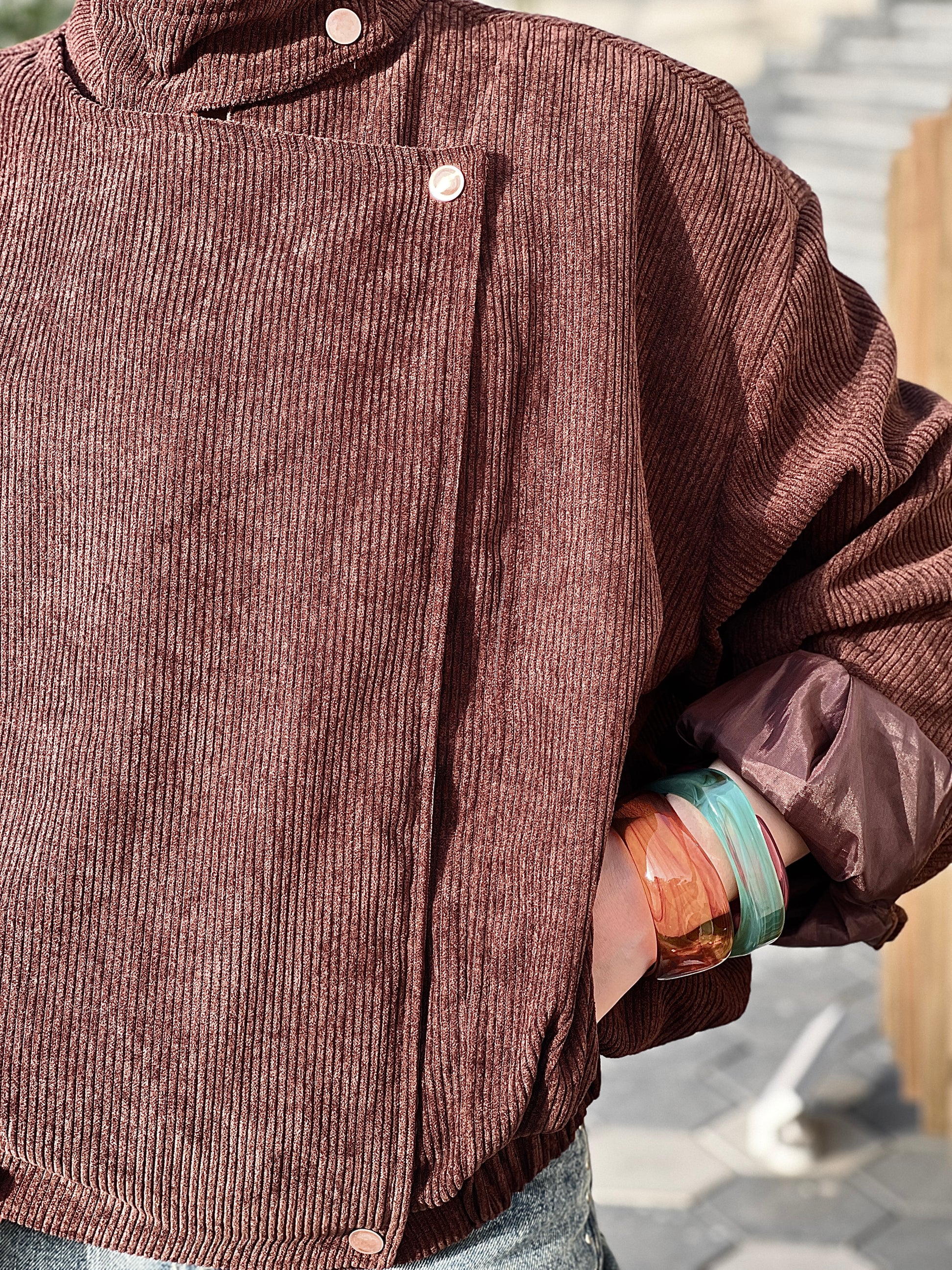Designed with a high neck and zipper for a sleek finish, copper snap buttons for a premium touch, and an oversized fit that makes winter styling easy and feminine.